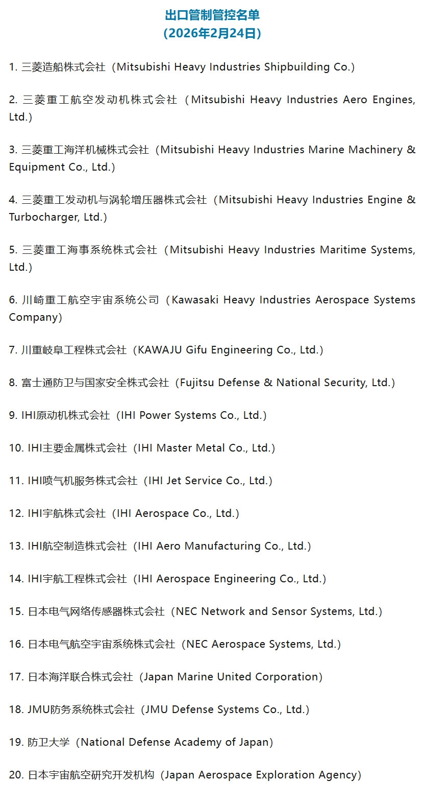 2月24日,商务部发布2026年第11号公告,将20家日本实体列入出口管制管控名单。根据《中华人民共和国出口管制法》和《中华人民共和国两用物项出口管制条例》等法律法规有关规定,为维护国家安全和利益,履行防扩散等国际义务,决定将三菱造船株式会社等参与提升日本军事实力的20家日本实体列入出口管制管控名单,并采取以下措施: