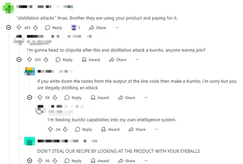 Anthropic将蒸馏行为称为“蒸馏攻击”,这一说法本质上也有些“文字游戏”的嫌疑。多位Reddit网友认为,即便其他公司确实利用其产品生成的数据进行训练,这本质上也只是用户在正常使用产品,而且这些用户是付了费的。