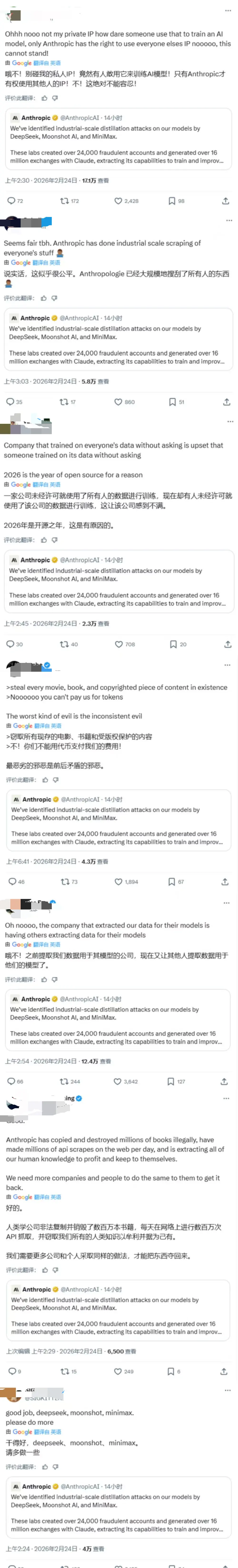 由于Anthropic的模型是闭源的,而三家中国AI公司的模型基本是开源的,因此甚至有网友认为,就算蒸馏行为的确存在,他们也支持这种行为,因为业界需要更强的Deepseek V4, Kimi K3和Minimax M3,没有用户会为Anthropic哭泣。