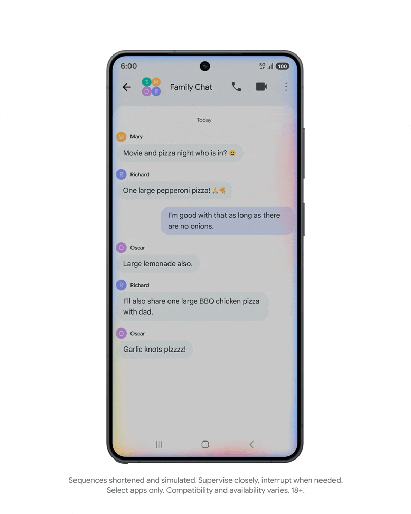 比如,当用户和朋友聊到聚会要订披萨,用户可以直接叫出 Gemini,吩咐一句“弄清楚订单”,Gemini 就能直接抓取聊天中提到的披萨店,甚至特定的披萨种类,整理好每个人的需求。