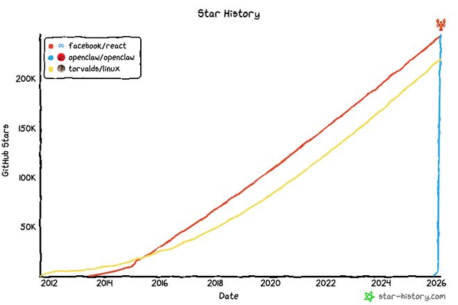 就在昨天下午,OpenClaw已经超越了所有GitHub开源软件项目的星标数(Star),正式加冕史上最受欢迎开源项目!更令人瞩目的是,OpenClaw的数据是以近乎垂直的直线飞速飙升的,爆发后仅仅用了今年前两个月,就超越了如Linux和React等众多持续更新了十多年的超大型基建项目!