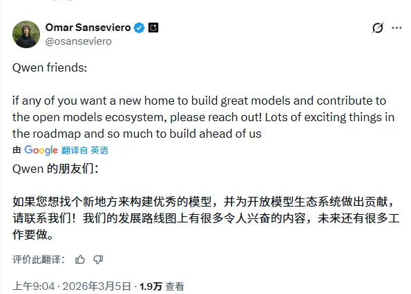 3月5日,阿里批准通义实验室林俊旸的辞职申请后,Google DeepMind开发团队相关负责人Omar Sanseviero公开向Qwen团队抛出了橄榄枝。“Qwen的朋友们:如果你们中有人想要一个新平台,一起打造优秀模型、为开源模型生态贡献力量,欢迎联系我。我们的规划中还有很多令人期待的项目,未来大有可为。”
