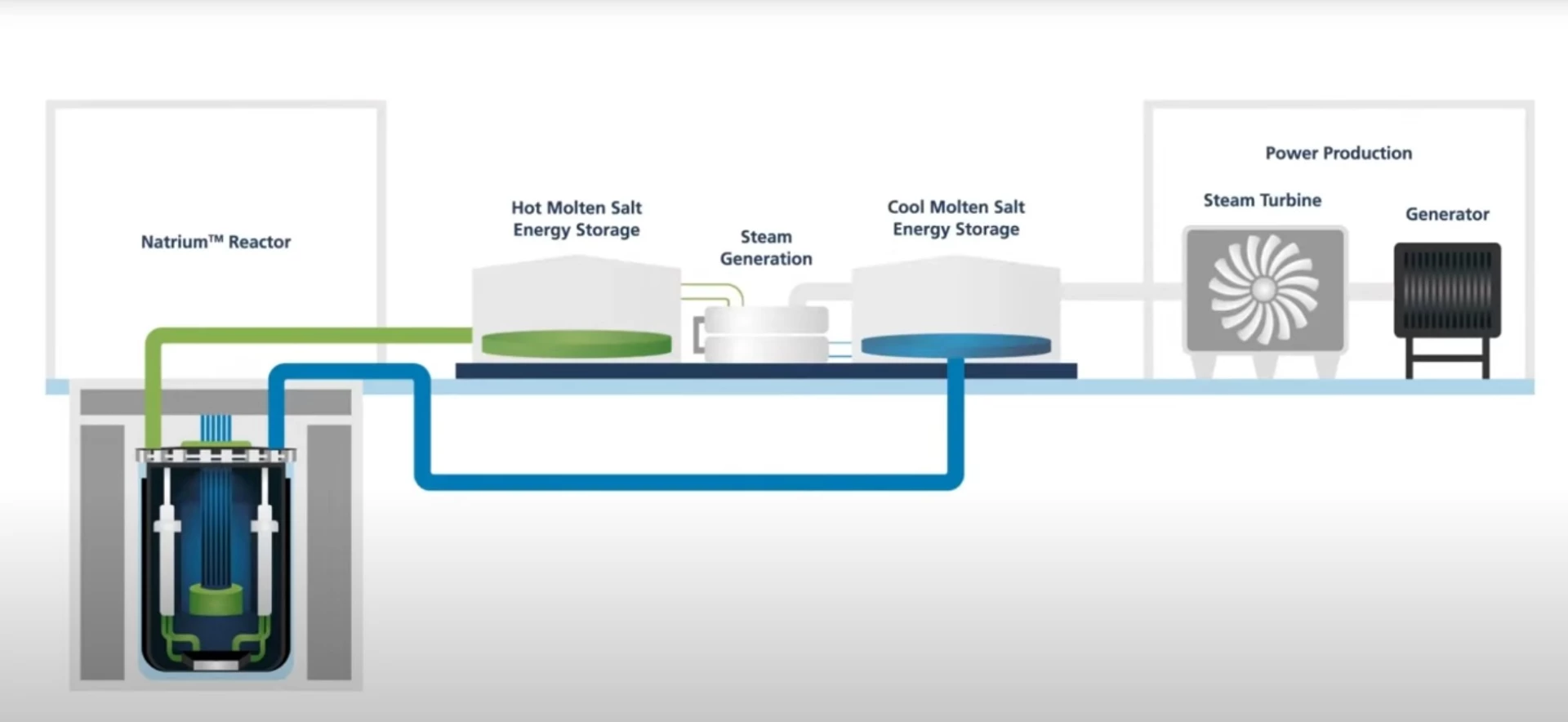 Natrium的厂站布局也颇具特色:反应堆部分与发电系统物理分离,堆内热量先由二回路钠循环带出,通过中间换热器传递给第三回路的熔盐系统,后者再与热储罐相连。 这些熔盐罐相当于一个大型“热能缓冲池”,在堆芯以840 MWt的稳定功率运行时,系统可根据电网负荷,将储存的热量按需送入汽轮机,实现类似调峰电源的柔性输出。 在可再生能源占比不断提高、电力系统波动加剧的背景下,这种堆电解耦和大规模热储能组合,被寄望于提升电网稳定性和灵活性。