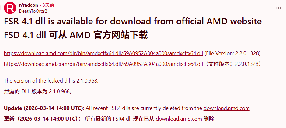 AMD公开下载目录显示,该文件仓库于3月11日更新,子文件夹中分别存放着3月2日(13.8MB)和3月12日(16.8MB)的两个DLL文件。