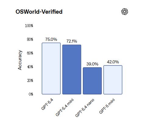 在计算机操控基准OSWorld-Verified上,mini以72.1%逼近GPT-5.4的75.0%,并大幅领先GPT-5 mini的42.0%。