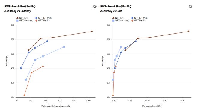 在编程基准SWE-bench Pro上,mini得分54.4%,与GPT-5.4的57.7%差距收窄至3.3个百分点,远高于GPT-5 mini的45.7%。