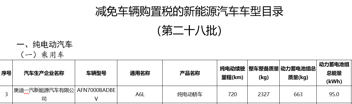 工信部日前发布《第二十八批减免车辆购置税的新能源汽车车型目录》,其中出现了一汽奥迪A6L e-tron的新车信息。目录显示,一汽奥迪A6L e-tron搭载95kWh的动力电池包,CLTC纯电续航720km,整车整备质量为2327kg。