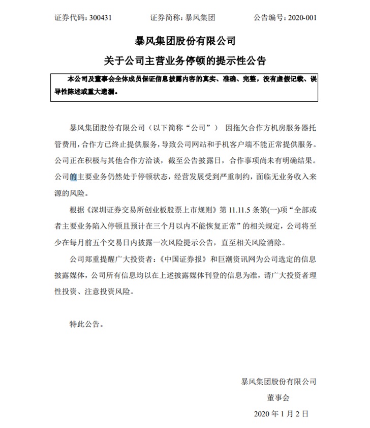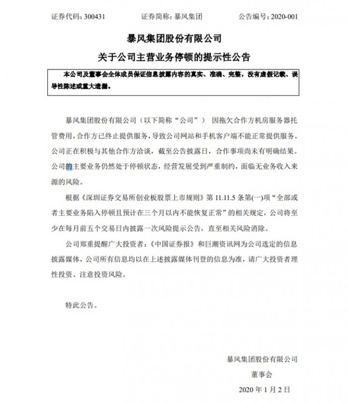 1月2日消息 暴风集团今日发布公告称,因拖欠合作方机房服务器托管费用,合作方已终止提供服务,导致公司网站和手机客户端不能正常提供服务。公司正在积极与其他合作方洽谈,截至公告披露日,合作事项尚未有明确结果。公司的主要业务仍然处于停顿状态,经营发展受到严重制约,面临无业务收入来源的风险。