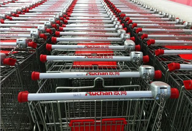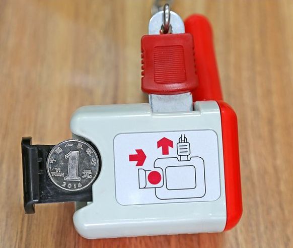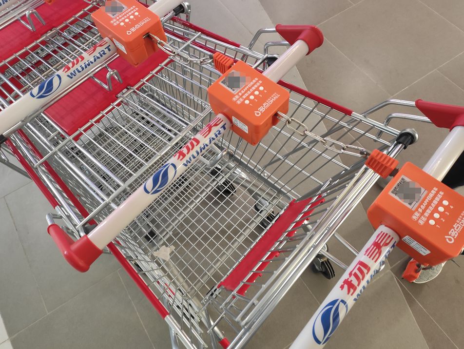 起因是这样的,前几年卖场为了减少购物车乱停乱放乱用的现象,推出过一种新的使用模式:每次使用购物车前需要在里面塞一个硬币,然后才能从人体蜈蚣一般的车队里将购物车解锁出来使用。