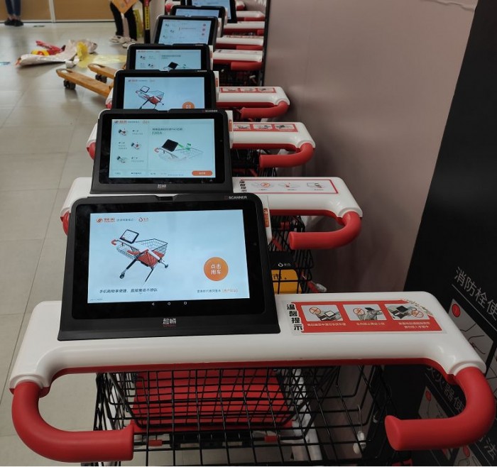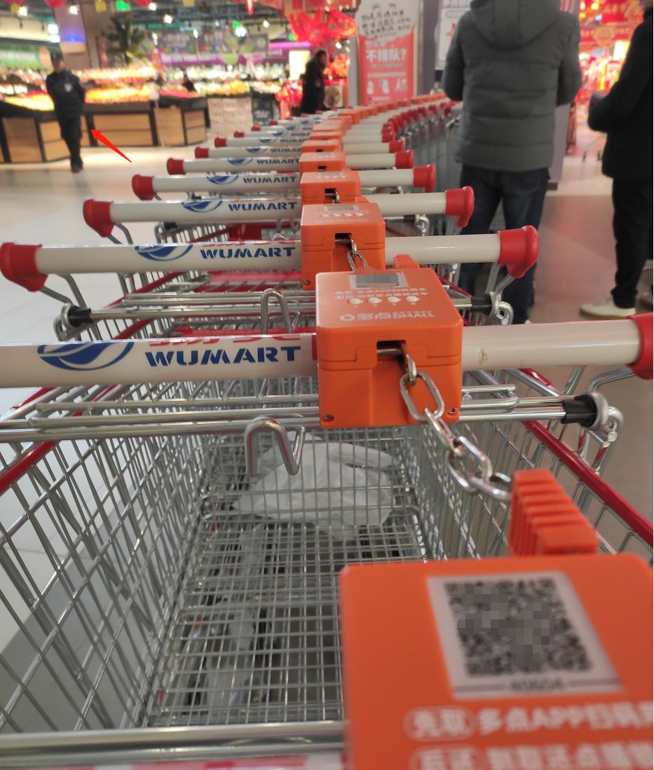 神奇的是,“ 物美 ” 还有一种带有扫码功能的购物车,从长相来看属于超进化Version. 的版本,从去掉了镣铐的队列方式就能看出它们的与众不同。
