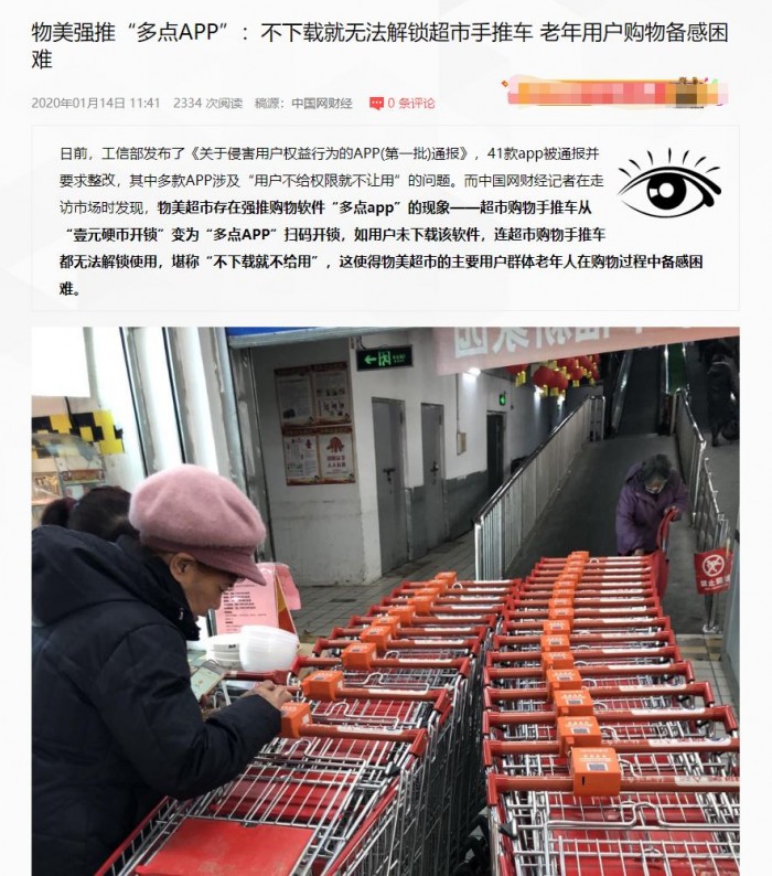 中国网财经,《物美强推“多点APP”:不下载就无法解锁超市手推车 老年用户购物备感困难》