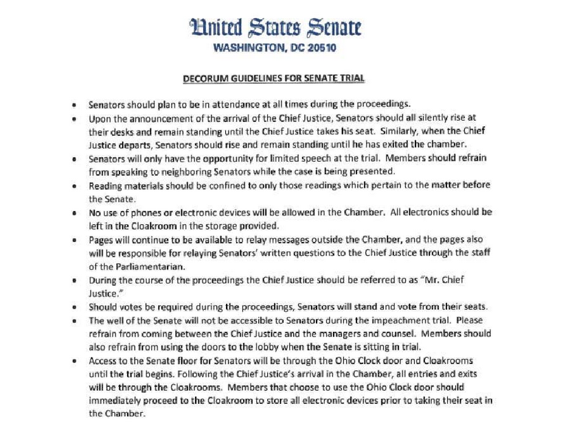 据外媒报道,美国参议院对特朗普总统的弹劾审判将于当地时间1月21日正式开始。不过,别指望会有参议员在Twitter上@特朗普,因为他们到时候得把手机放在门口。同样的,平板电脑和笔记本也不能带进去。根据CNN获得一份关于弹劾特朗普的官方“礼仪指南”指出,该场活动不允许参与者携带电子设备入内。