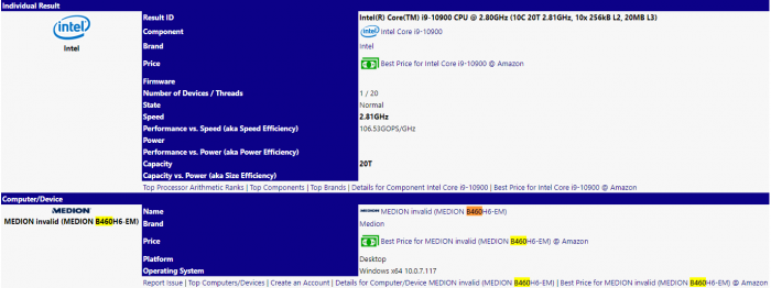 SiSoftware数据库里近日出现了德国品牌Medion的B460,具体型号B460H6-EM,搭配的是10核心20线程的酷睿i9-10900,基准频率2.8GHz,三级缓存20MB,和此前曝料相符,睿频最高目前看是4.9GHz。