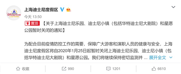 为配合目前疫情防控工作的需要,保障广大游客和演职人员的健康与安全,上海迪士尼度假区将自2020年1月25日起暂时关闭上海迪士尼乐园、迪士尼小镇(包括华特迪士尼大剧院)和星愿公园。我们将继续保持密切监测并与政府部门保持紧密沟通,另行通知恢复开放的时间。