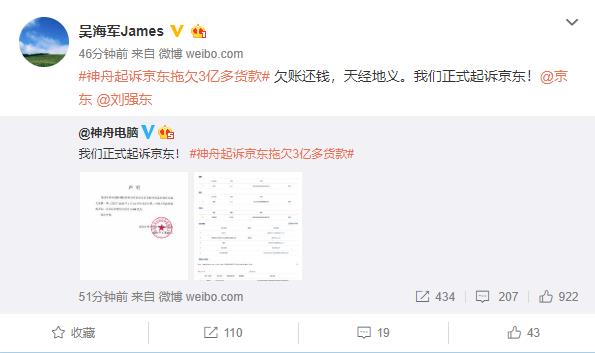 2月20日消息,今日,神舟电脑在其官方微博宣布因京东拖欠其贷款一事,已于2月18日向北京第二中级人民法院提起诉讼,标的额3.383亿元。神舟电脑集团董事长吴海军随后转发该微博表示“欠债还钱,天经地义”。