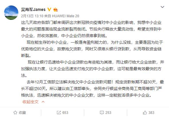 此前在2月13日,神舟电脑集团董事长吴海军在微博中谈到当前中小微企业困境,呼吁官方与其给贷款,不如敦促上游大企业大平台迅速支付拖欠的中小企业款项,解决流动性。这才是当前困境根本解决之道,更具操作性更有广泛性。