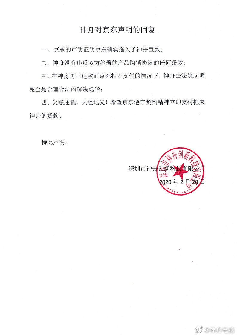 1、京东的声明证明京东确实拖欠了神舟巨款