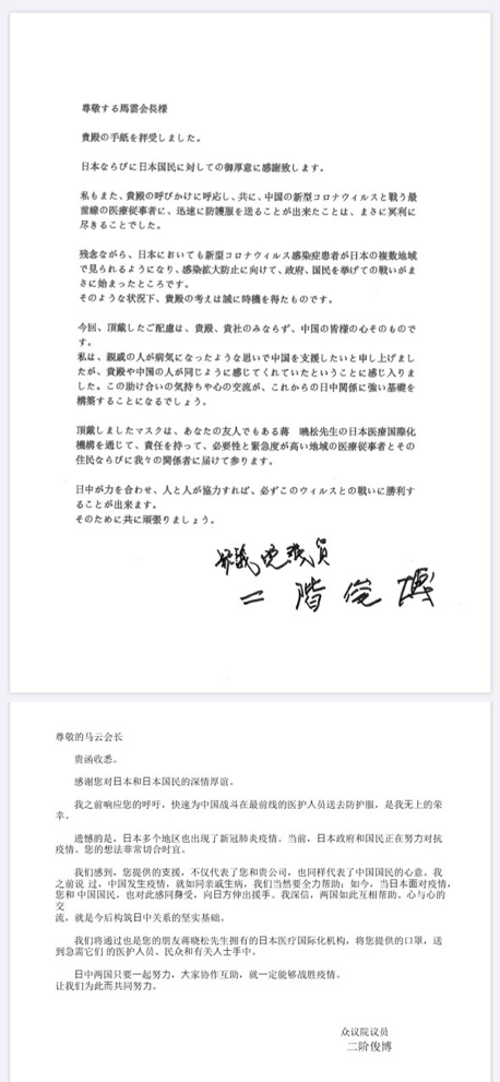 3月2日,在捐赠日本100万只口罩的同时,记者了解到,马云和二阶俊博先生还特地相互致函,为在抗击疫情中的无私帮助表达谢意。二阶俊博在接受当地媒体采访时也表示:“真的很感激。朋友,就是那些在我困难时帮助我的人。”在马云公益基金会的微博上,网友可以看到这两封别具意义的信函。
