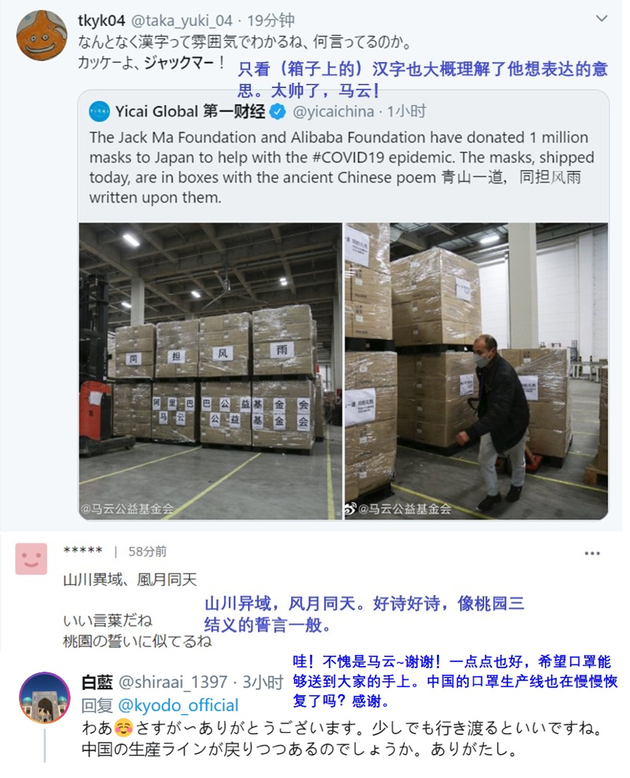 日本网友为马云捐赠100万只口罩点赞