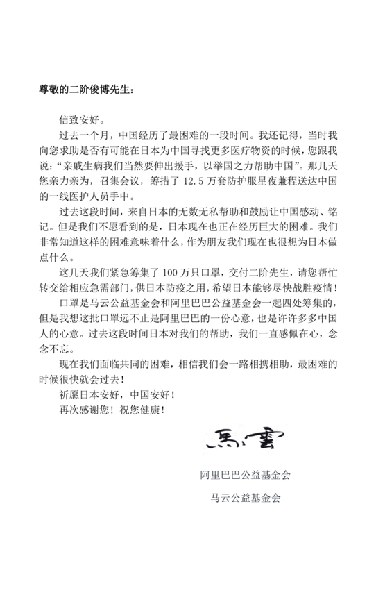 二阶俊博致马云的感谢信
