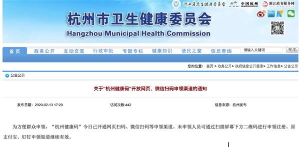 2月13日,杭州市政府曾召开新闻发布会,发布了杭州健康码,并支持微信、支付宝、钉钉等多个端口打开,方便市民领取。