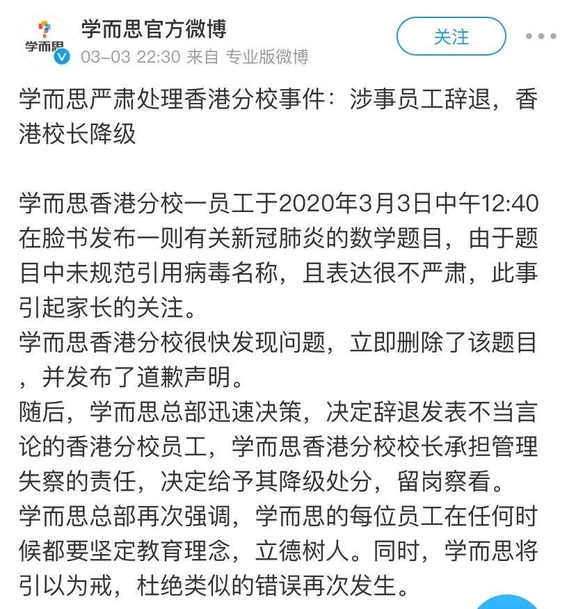 学而思香港分校一员工于2020年3月3日中午12:40在脸书发布一则有关新冠肺炎的数学题目,由于题目中未规范引用病毒名称,且表达很不严肃,此事引起家长的关注。学而思香港分校很快发现问题,立即删除了该题目,并发布了道歉声明。