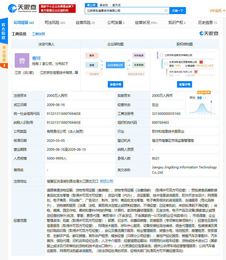 江苏京东信息技术有限公司成立于2009年6月,注册资本为2000万人民币,经营范围包括道路普通货物运输,货物专用运输(集装箱),货物专用运输(冷藏保鲜)等。天眼查股东信息显示,该公司为京东运营主体北京京东世纪贸易有限公司全资子公司。