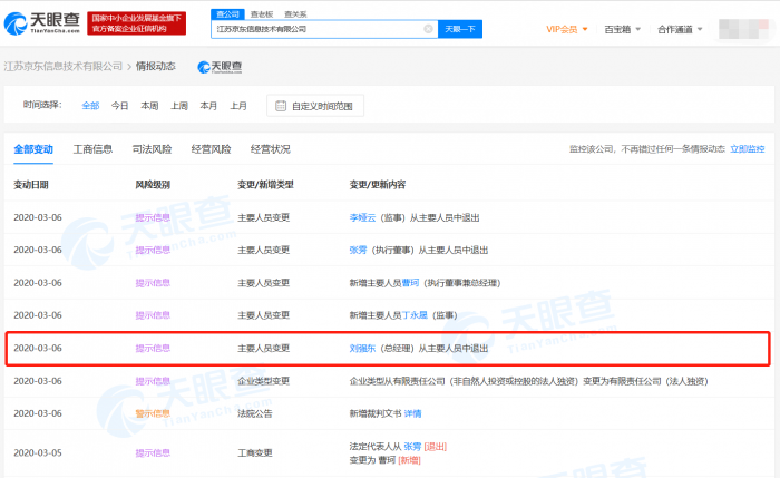 据天眼查数据显示,近日,京东旗下全资子公司江苏京东信息技术有限公司发生工商变更,刘强东卸任该公司总经理一职,同时,张雱卸任该公司执行董事、法定代表人,以上职位,均由曹珂接任。此外,李娅云卸任该公司监事,由丁永晟接任。