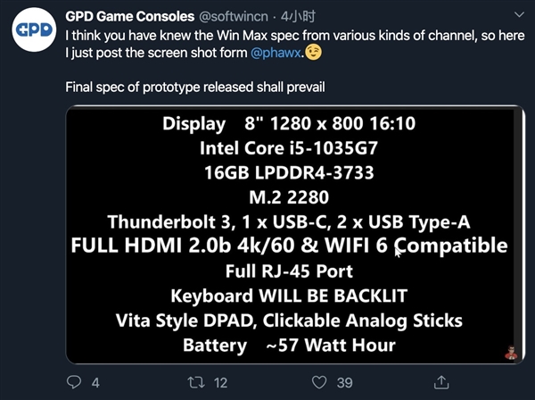 3月9日,GPD官推正式公布了全新迷你笔记本GPD Win Max的全套规格!GPD Win Max将搭载一块8英寸大小1280x800分辨率16:10屏幕,处理器是十代酷睿i5-1035G7,内置16GB LPDDR4 3733MHz内存,M.2 2280存储。