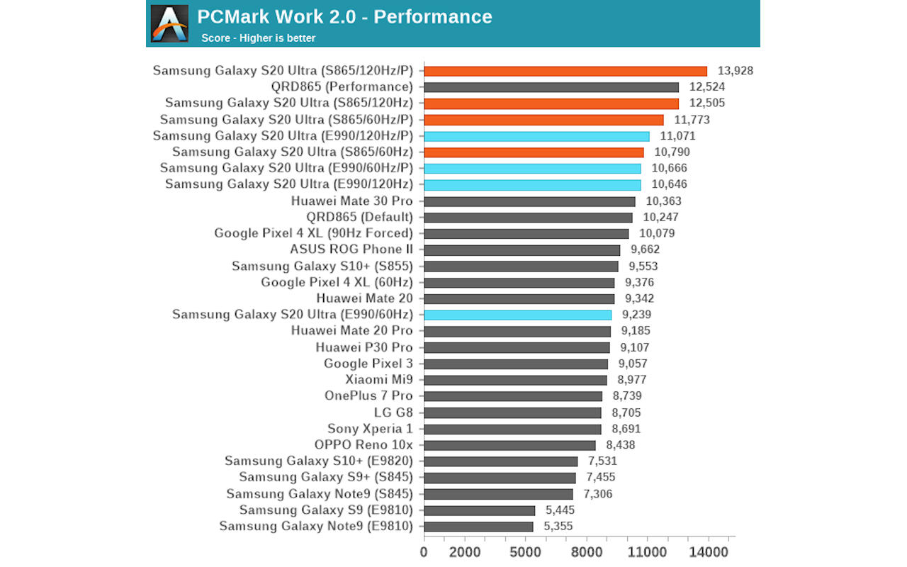 基准和评测结果却显示出了相当大的差异,AnandTech的数据显示,Galaxy S20 Ultra的Exynos 990芯片在性能上落后于其骁龙865的兄弟机型。除了性能上的差距之外,Exynos芯片也被注意到GPU的降频更主动,其高性能模式下,性能差异更大。