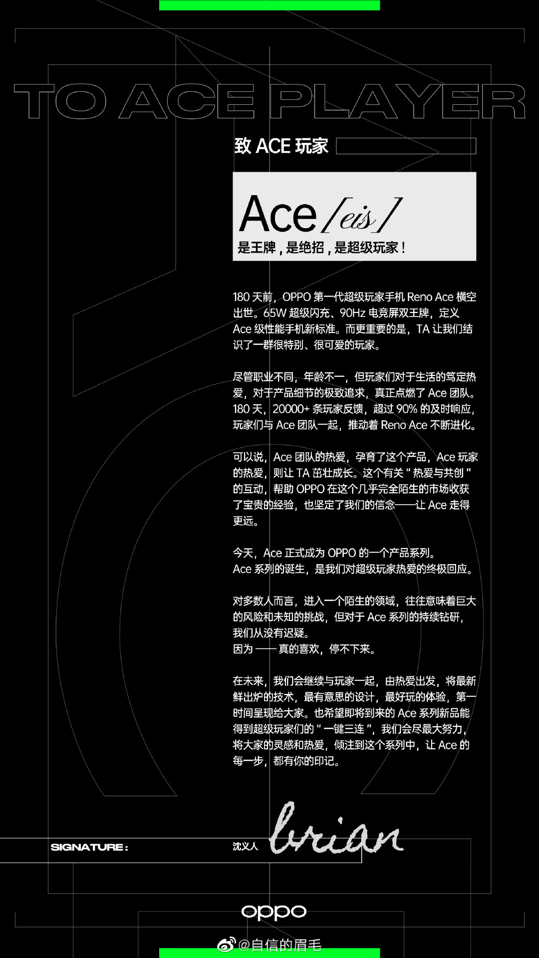 4月7日,OPPO广东移动通信有限公司(以下简称:OPPO)官方微博发布Ace超级玩家精神视频,展示Ace的玩家精神。同时,OPPO副总裁、全球营销总裁沈义人在微博发布《致Ace玩家》的公开信,正式宣布Ace成为OPPO的一个产品系列。