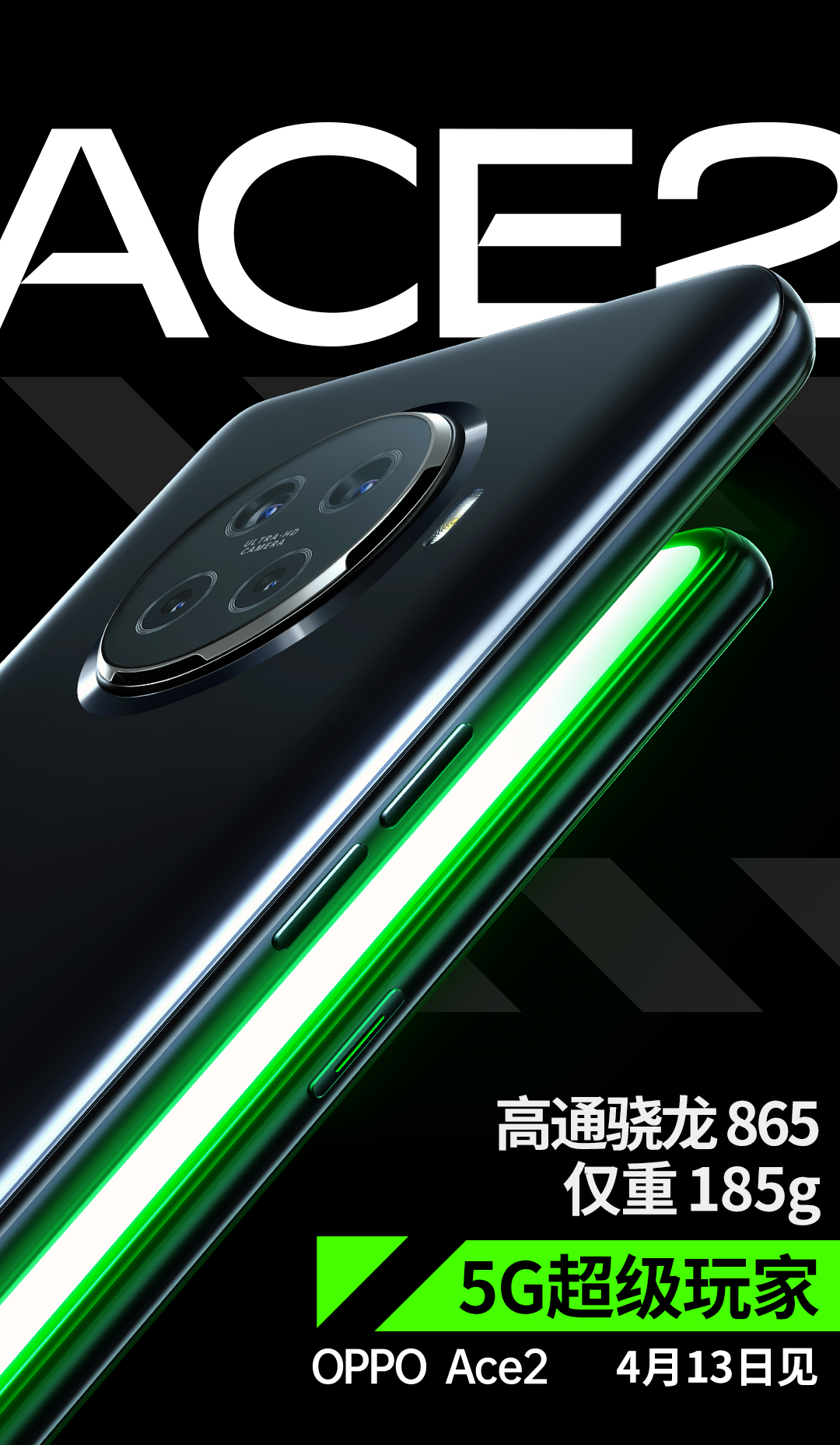 OPPO广东移动通信有限公司(以下简称:OPPO)宣布5G超级玩家OPPO Ace2将于4月13日举办发布会,搭载骁龙865处理器,并采用创新的轻薄机身设计,整机重量仅为185g。