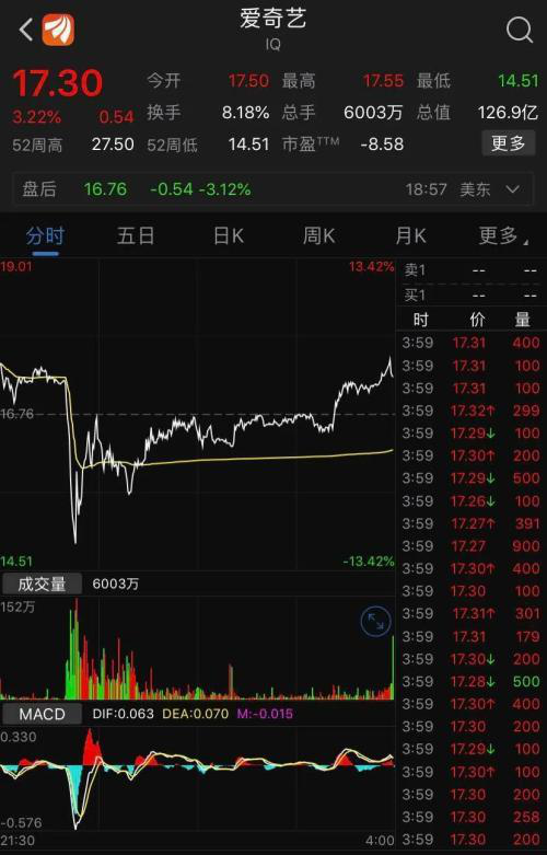 该声明发布后,爱奇艺股价在盘中并转跌为升。截至收盘,爱奇艺股价报收于17.30美元,收涨3.22%。