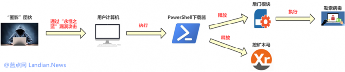 Qihoo 360安全团队进行分析后发现此次勒索软件的开发者其实就是匿影黑客团队,这个黑客团队在国内前科也比较多。360 安全大脑同源性数据分析发现此次勒索软件攻击手法与相关代码与此前专注于挖矿的匿影黑客团队几乎相同。这个黑客团队惯用的套路就是利用 BT 下载器以及激活工具来传播病毒 , 此前也曾借助永恒之蓝漏洞传播过病毒。在感染用户计算机后会执行PowerShell下载模块 , 然后再释放挖矿模块 , 只是这次释放的是后门模块和勒索软件。腾讯御见威胁情报中心此前监测到多次该团队释放挖矿模块利用用户计算机的处理器挖掘XMR门罗币和PASC币。