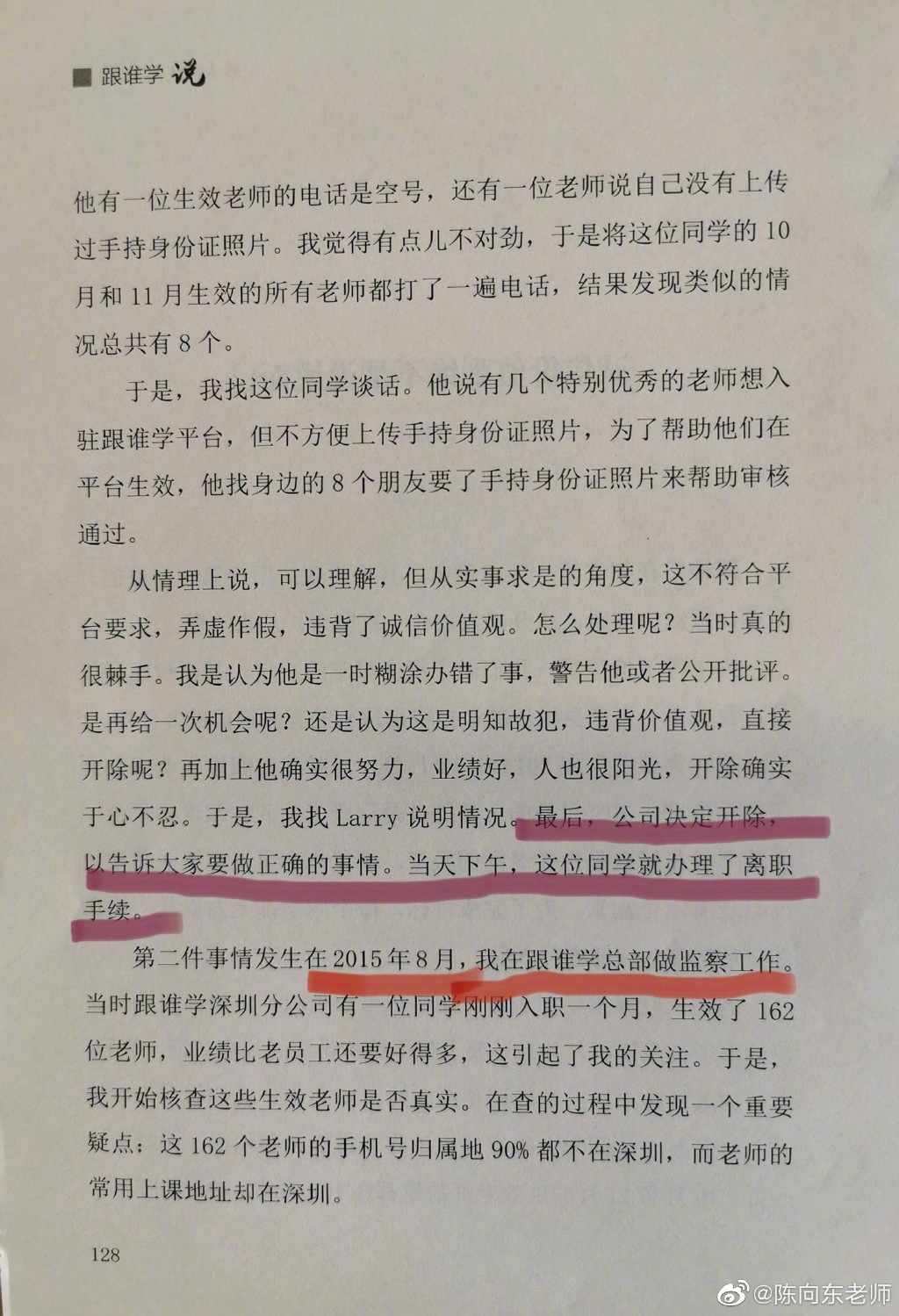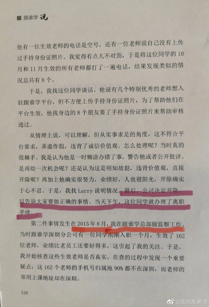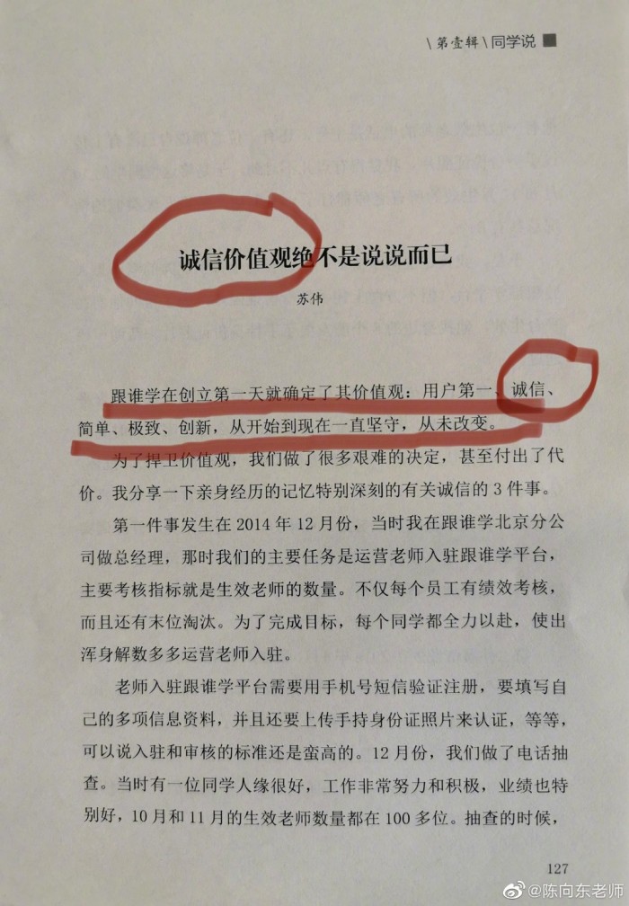还有,做空机构还不断提到了所谓的某媒体曾经报道的跟谁学在2015年的刷单事件。在这里,我想强调的是,第一,某媒体的报道大多是主观捏造的;第二,2015年跟谁学还是以O2O平台为主,确有极少一部分入驻跟谁学的老师和机构为了排名靠前进行刷单,当时我们对其中一些老师和机构做了处罚,我们对一些违背价值观的员工做了处理,但跟谁学绝对没有纵容刷单;第三,我们真的是一家非常非常强调价值观的公司,在违背公司价值观的行为和事件上,我们是绝对不迁就绝对不含糊的。感兴趣的朋友可以看看我们在2014年成立伊始就开始做到的、倡导的和践行的。