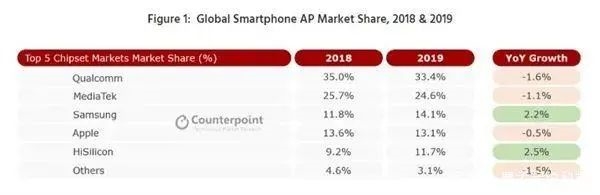 根据统计机构Counterpoint ReseARch发布的智能手机AP(相对于BP基带的应用处理器)列表显示,华为海思位居第五。