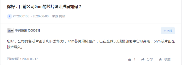 这则澄清源于中兴通讯于6月17日在深交所平台上答复投资者询问5nm芯片设计进展时,中兴通讯董秘表示“公司具备芯片设计和开发能力,7nm芯片规模量产,已在全球5G规模部署中实现商用,5nm芯片正在技术导入”,该消息被部分自媒体曲解为中兴通讯已能自行量产7nm芯片,此后中兴通讯市值暴涨150亿。