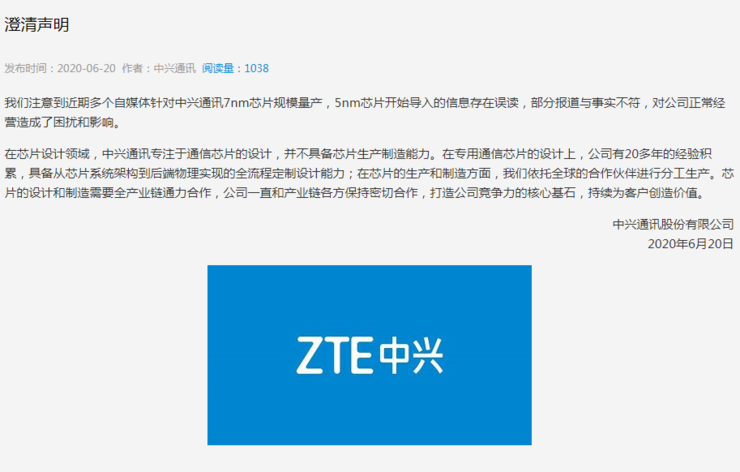 中兴通讯官网于6月20日更新一则“澄清声明”,声明称“近期多个自媒体对中兴通讯7nm芯片规模量产,5nm芯片开始导入的信息存在误读,部分报道与事实不符,对公司正常经营造成了困扰和影响”,并解释“中兴通讯专注通信芯片的设计,并不具备芯片生产制造能力”。