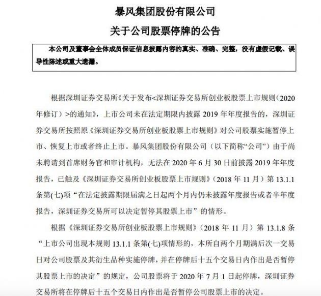暴风集团股份有限公司(以下简称“公司”)由于尚未聘请到首席财务官和审计机构,无法在2020年6月30日前披露2019年年度报告,已触及《深圳证券交易所创业板股票上市规则》(2018年11月)第13.1.1 条第(七)项“在法定披露期限届满之日起两个月内仍未披露年度报告或者半年度报告,深圳证券交易所可以决定暂停其股票上市”的情形。
